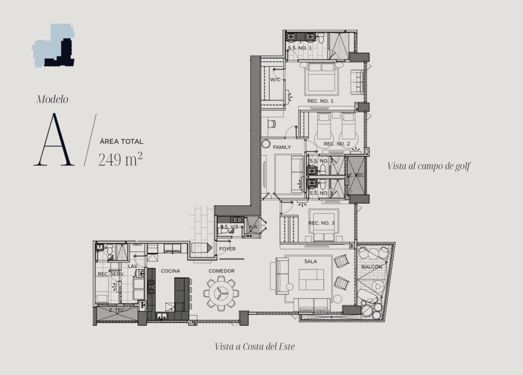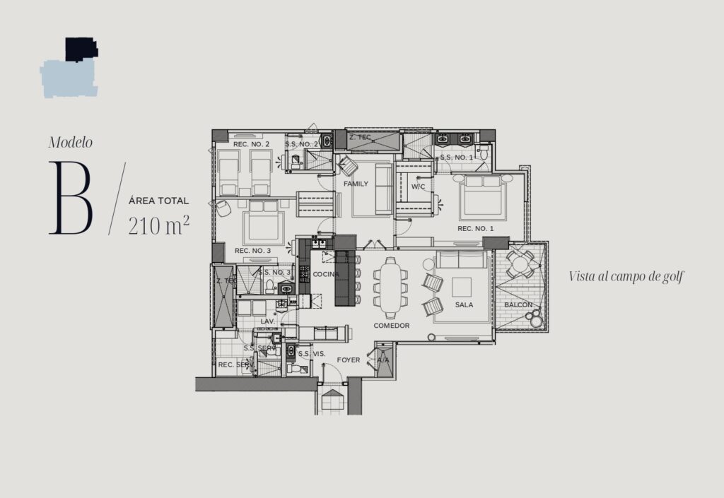 Amplios espacios con distribución inteligente, cocina cerrada y balcón con espectaculares vistas al campo de golf. Ideal para quienes buscan elegancia, amplitud y privacidad.